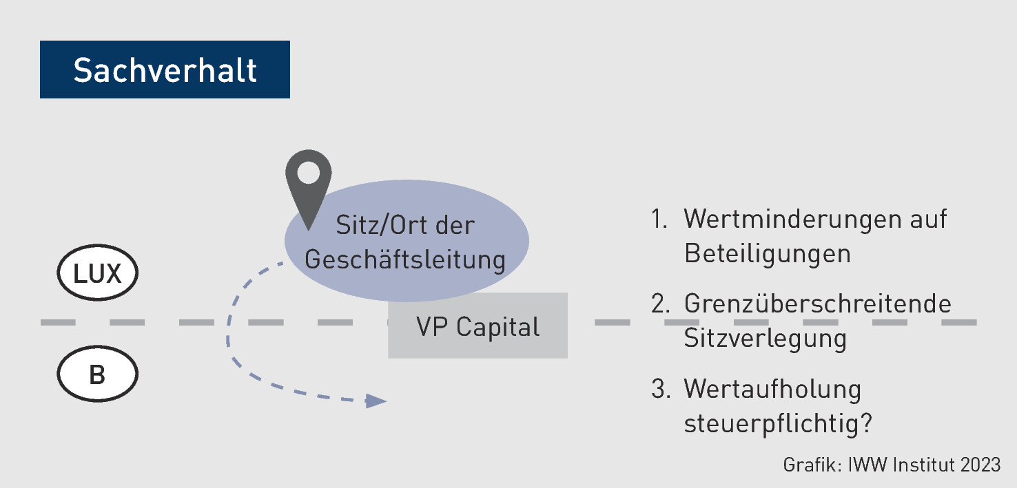 VP Capital, eine in Luxemburg gegründete Gesellschaft mit Sitz in Luxemburg, verbuchte Teilwertabschreibungen auf verschiedene Beteiligungen, die sie an anderen Gesellschaften hielt. Sie zog diese Wertminderungen von ihren Steuerergebnissen in Luxemburg ab, was zu einer Erhöhung ihrer vortragsfähigen Verluste führte. Aufgrund ihrer defizitären Lage konnte VP Capital diese vortragsfähigen Verluste in Luxemburg nicht geltend machen. Im Mai 09 verlegte VP Capital ihren Sitz nach Belgien und wurde in eine Gesellschaft belgischen Rechts umgewandelt.