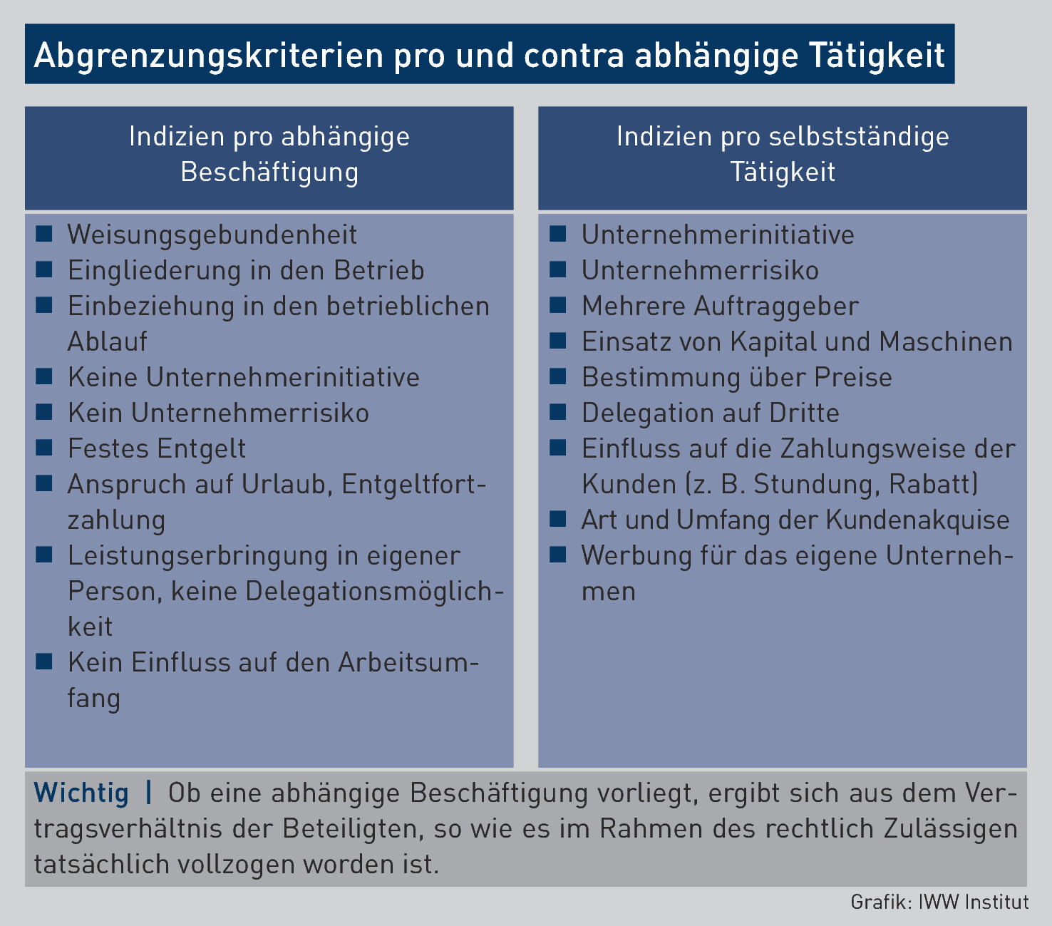 Gemeinnützige Einrichtungen sollten bei der Vereinbarung von „freier Mitarbeit“ möglichst vor Beginn der Arbeitsaufnahme ein Statusfeststellungsverfahren einleiten. Die Rechtsprechung ist – wie auch das Urteil zeigt – sehr restriktiv. Besondere Sorgfalt erfordert die Tätigkeitsbeschreibung und -ausführung. Wird die Tätigkeit regelmäßig auch durch selbstständige Dritte angeboten, umso höher ist die Gewähr, dass auch die beabsichtigte Mitarbeit als selbstständige Tätigkeit eingestuft werden könnte. Nachfolgend die Abgrenzungskriterien, nach denen die Gerichte urteilen, im Überblick.